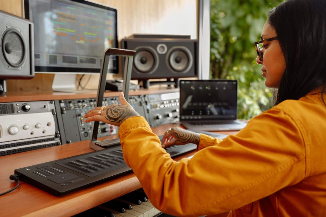 A women playing ROLI Airwave with ROLI Seaboard M in a home studio